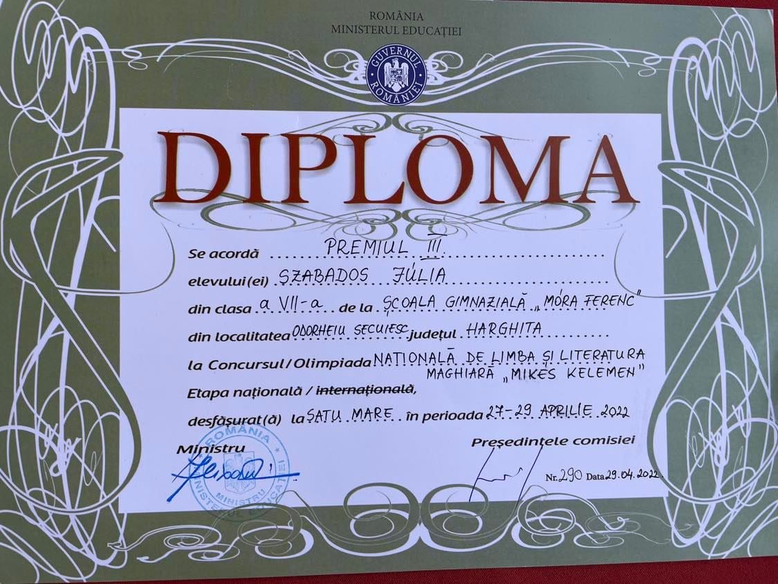 Szabados Júlia, VII. A osztályos tanuló III. díjban részesült, valamint Szatmárnémeti Polgármesteri Hivatalának különdíját is elnyerte.