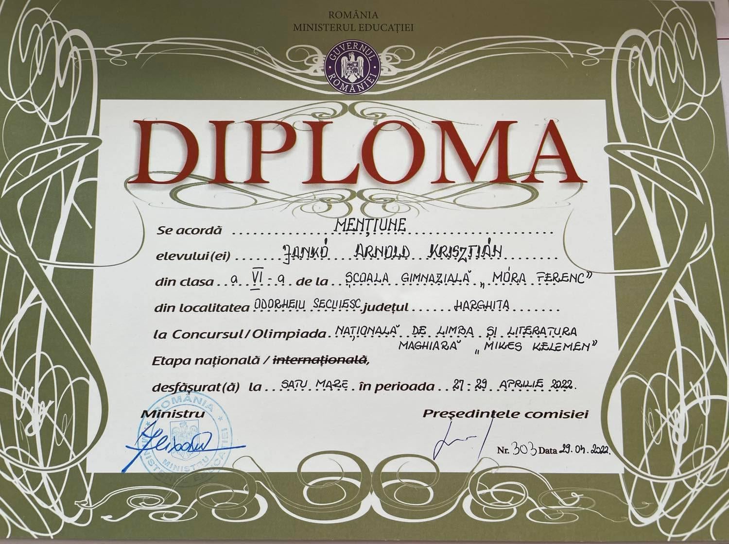 Jankó Arnold Krisztián, VI. B osztályos tanuló dicséretben részesült, ugyanakkor a Kárpát-medencei Magyartanárok Kulturális Egyesülete különdíjjal is jutalmazta.